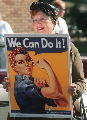 ☻ Geraldine Hoff Doyle appeared at a number of poster signings and events at the Michigan Women's Historical Center and Hall of Fame over the years. ☻ A news service photo of Doyle is believed to have been the model for the 'We Can Do It!' poster, a Rosie the Riveter image from World War II. ☻ Doyle was operating a metal-stamping machine when a United Press photographer took a picture of the tall, slender and glamorously beautiful brunet wearing a polka-dot bandana over her hair. |