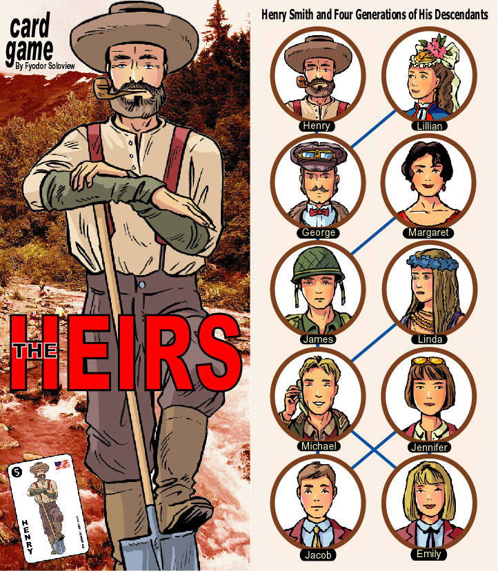 The pack of genealogical playing cards, called "Six Generations," should be used to play "The Heirs." Instead of using an entire 72-card deck, which was designed by Six Generations Publishing in 2004 to play family history "Six Generations Card Game," "The Heirs" need to be played with 32 cards only. Two players, one of them helping Emily, and another helping Jacob, must open cards with all their ancestors in five generations, placed at random, and have them join the thrilling fight for the inheritance.